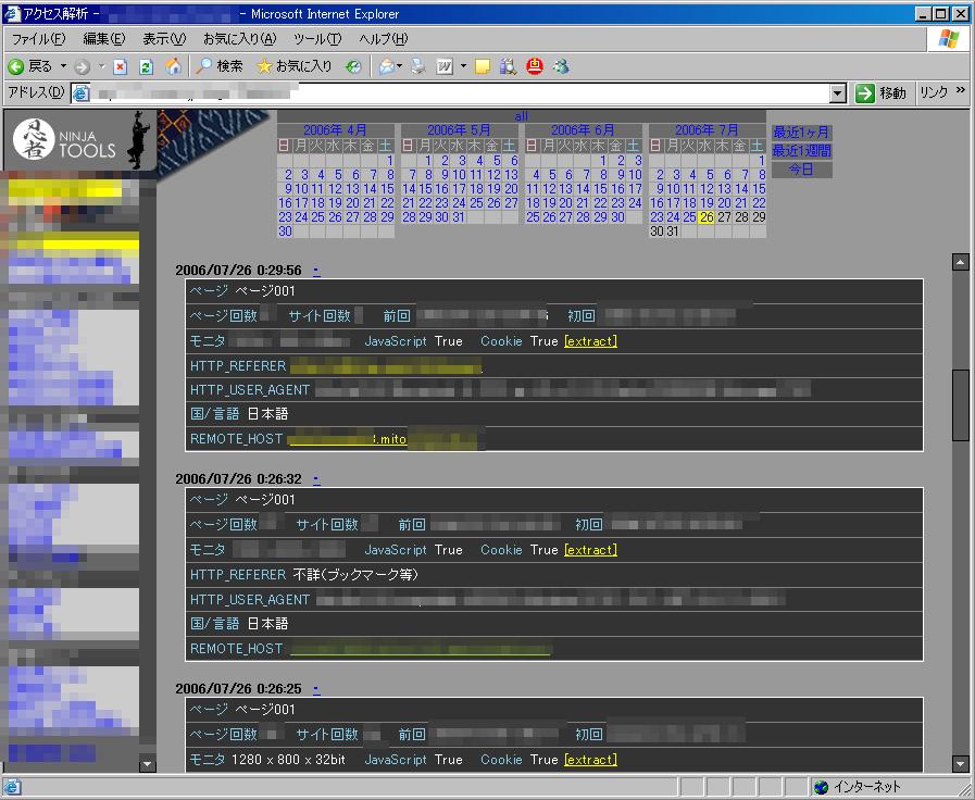 回線名(ADSLとかPHS)、プロバイダ名(ZAQとかPLALAとか)とか解析装置を入れているといろいろなことがうわかるのです。ほかには使っているOS、使っているディスプレイの解像度や使っているブラウザ、どこからここへ飛んできたかがわかるようになっているんです。