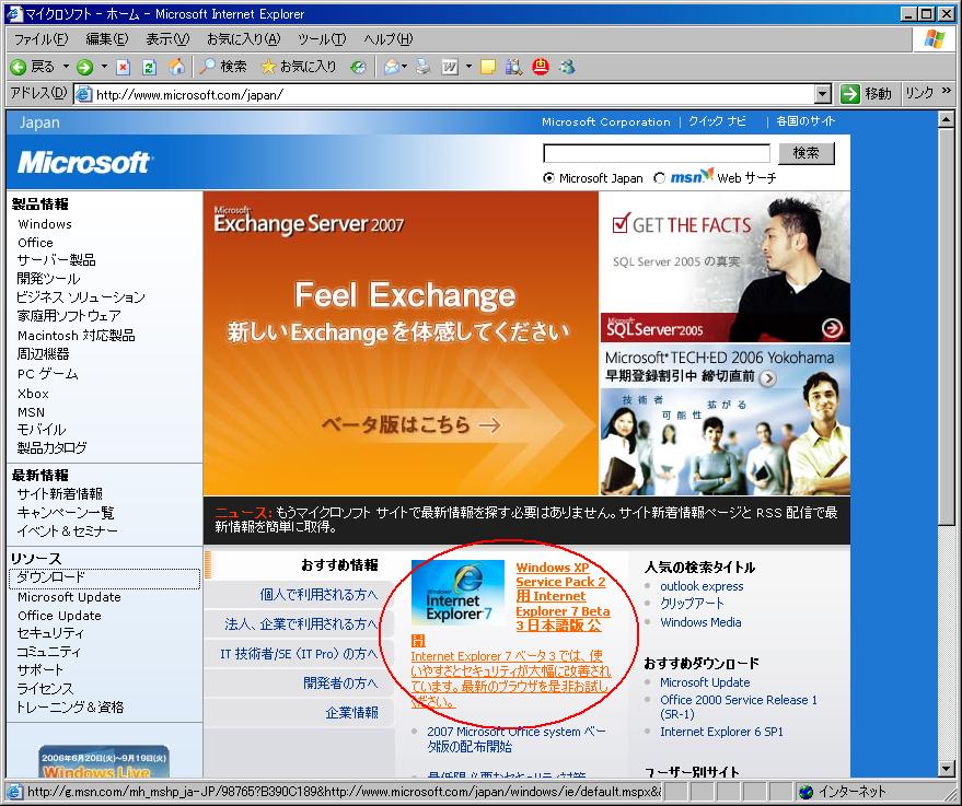 IE7はマイクロソフトのトップからリンクが張ってあって